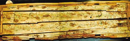 1998年新城魏晉南墓出土。這副完整的木棺由棺身和棺蓋組成,棺蓋內(nèi)側(cè)有一長方形凹面,內(nèi)彩繪伏羲女媧圖。伏羲女媧人首蛇身,兩尾相交,伏羲在右,左手執(zhí)矩,女媧在左,右手執(zhí)規(guī)。伏羲女媧周圍飾云氣紋。棺身呈長方體,兩檔頭用墨線勾畫星象圖,棺內(nèi)側(cè)四壁彩繪幃帳、絹帛、蠶繭等圖形。