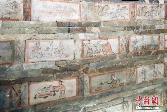 位于甘肅嘉峪關市的嘉峪關新城魏晉墓群,內有千余座魏晉古墓,從1972年起,先后發(fā)掘18座,其中9座為畫像磚墓。磚壁畫取材于現(xiàn)實生活,用連環(huán)畫的方式反映出了當時河西地區(qū)生活、生產、軍事、文化的真實情景,具有濃厚的生活氣息。目前只開放的六號墓,其壁畫內容豐富,具有很強的代表性。高展 攝