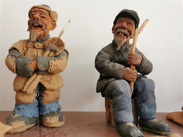 記者環(huán)顧四周,只見滿臉堆笑的“老頭老太”、活潑可愛的“牧童”、陽光清純的“少先隊員”等泥塑作品形象鮮活生動,依次有序地擺放在展架上。