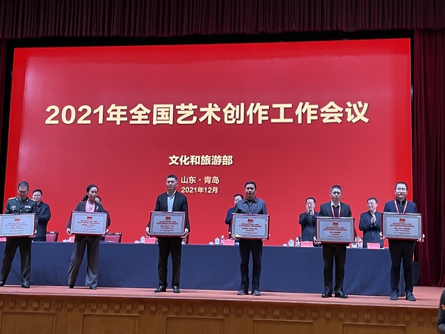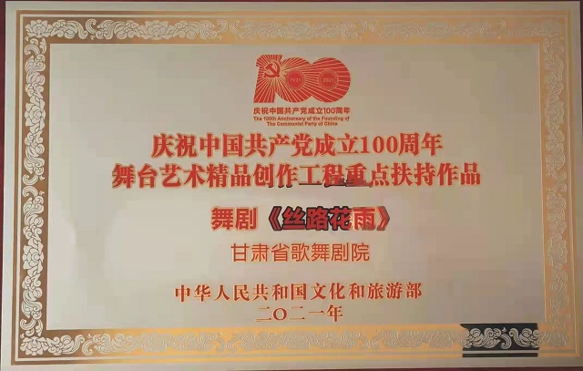 中國(guó)甘肅網(wǎng)12月19日訊 12月18日,文化和旅游部在山東省青島市召開的“2021年全國(guó)藝術(shù)創(chuàng)作工作會(huì)議”上,發(fā)布了“慶祝中國(guó)共產(chǎn)黨成立100周年舞臺(tái)藝術(shù)精品創(chuàng)作工程”入選名單,頒發(fā)了“慶祝中國(guó)共產(chǎn)黨成立100周年舞臺(tái)藝術(shù)精品創(chuàng)作工程獎(jiǎng)牌”。甘肅省文化和旅游廳遴選推薦的舞劇《絲路花雨》《大夢(mèng)敦煌》《彩虹之路》、隴劇《官鵝情歌》、小品《你笑起來真好看》等5部舞臺(tái)藝術(shù)精品,經(jīng)文旅部評(píng)審正式入選“舞臺(tái)藝術(shù)精品創(chuàng)作工程重點(diǎn)扶持作品”。甘肅省歌舞劇院創(chuàng)排的舞劇《絲路花雨》作為12家“百年百部”工程受獎(jiǎng)單位在全國(guó)藝術(shù)創(chuàng)作工作會(huì)議上接受獎(jiǎng)牌和榮譽(yù)證書,甘肅省文旅廳、山東省文旅廳等參會(huì)代表12家領(lǐng)獎(jiǎng)單位上臺(tái)領(lǐng)獎(jiǎng),充分展現(xiàn)了文旅部對(duì)甘肅省入選作品質(zhì)量及組織工作的高度肯定。