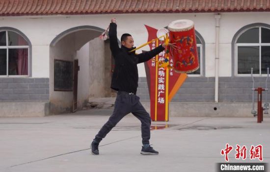 2月中旬,在蘭州市永登縣苦水鎮(zhèn),33歲鄧鑫擊打起太平鼓。 九美旦增 攝