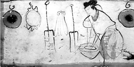 糧食、蔬菜品種與前代相比沒有大的變化,仍是漢地人的主要經(jīng)濟和衣食來源。烹飪方法,這一時期出現(xiàn)了面粉發(fā)酵技術(shù)。北魏賈思勰介紹發(fā)面技術(shù)說:“面一石,白米七八升作粥,以白酒六七升酵中,著火上,酒魚眼沸,絞去滓,以和面,面起可作”(《齊民要術(shù)》卷9)。把北魏時期的容量數(shù)換算成今天的市斤,上段話的意思就是,用五十多斤面粉,五六斤白米做粥,再用四五斤白酒(甜米酒)做酵母,將酒架火上燒至發(fā)出魚眼樣的小泡后,濾去酒渣,加入面粥中發(fā)酵,等面發(fā)起后就可以做餅了。這是一項歷史性的烹飪技術(shù)。從發(fā)面的數(shù)量看,一次發(fā)這樣多面的家庭,至少有三五十口人,顯然是當時世家大族的人口規(guī)模。世族如此,普通民眾也應(yīng)很快就學習掌握了發(fā)面技術(shù)。
