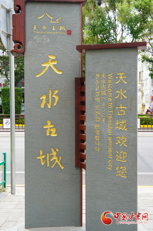 天水古城的路牌,上面用古建筑輪廓勾勒出天水古城的標志。
