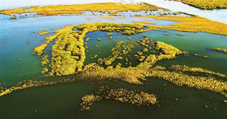 進(jìn)入10月,位于武威市民勤縣的亞洲最大沙漠水庫(kù)——紅崖山水庫(kù)群鳥歡鳴,湖水碧藍(lán)。水柳倒映之下,猶如一朵朵金黃的秋菊盛開。時(shí)值水鳥遷徙,大雁、白鷺、赤麻鴨、大天鵝等水鳥或在空中翱翔,或在湖中覓食,金黃金黃的胡楊樹葉閃爍鋪呈,一層又一層光暈,映照出一幅大漠水庫(kù)的金秋勝景。