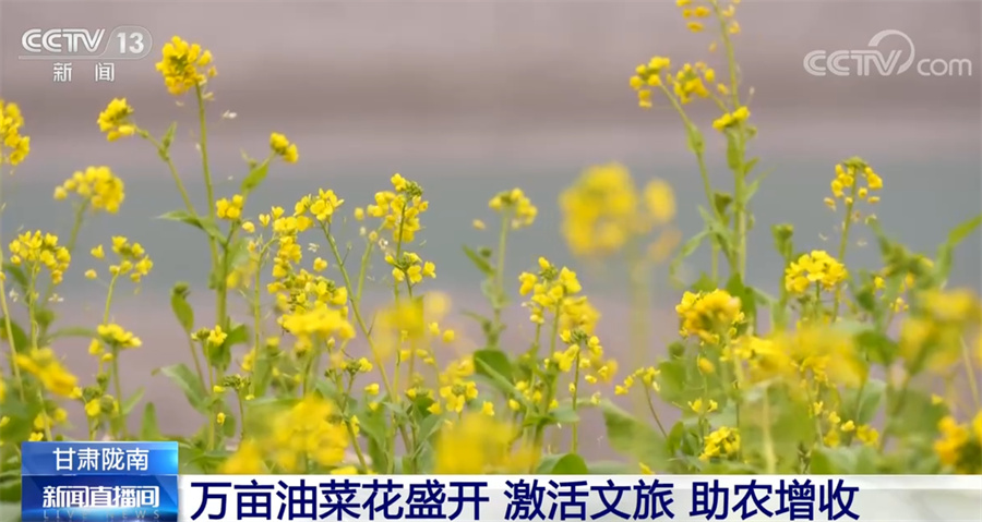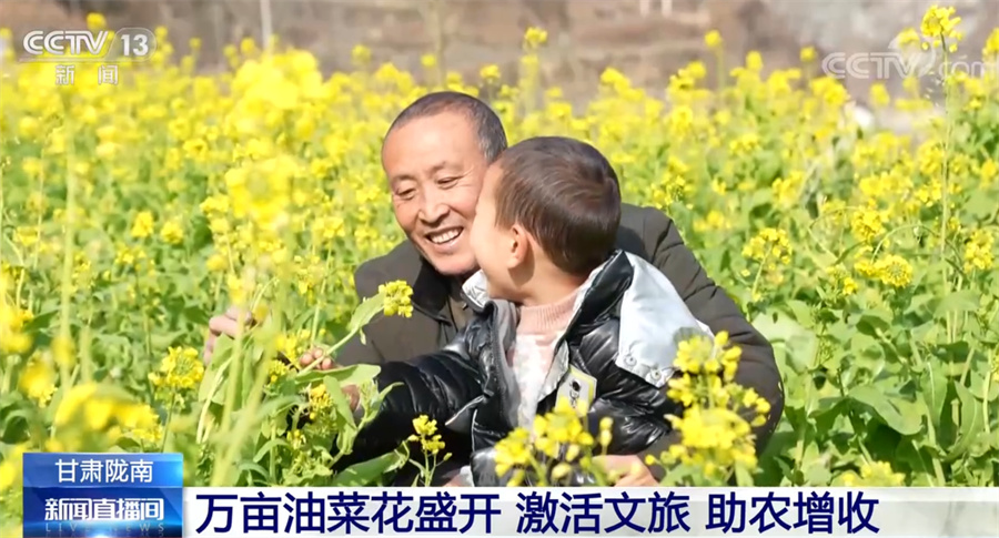 總臺記者 項思:這里是甘肅省隴南市文縣,位于甘肅的最南端,也是甘肅最早迎來春天的地方。一江碧水、兩岸青山,大面積盛開的油菜花迎著和煦的春風(fēng)泛起金色的波浪,一股濃烈的春天氣息撲面而來。從春節(jié)前10天左右,這里的萬畝油菜花就陸續(xù)開放了。如今步入春天,油菜花已進(jìn)入盛花期。文縣接壤四川,嘉陵江的上游白龍江穿越境內(nèi),氣候溫暖潮濕,具有夏無酷暑、冬無嚴(yán)寒的氣候特點(diǎn),被稱為“隴上江南”。