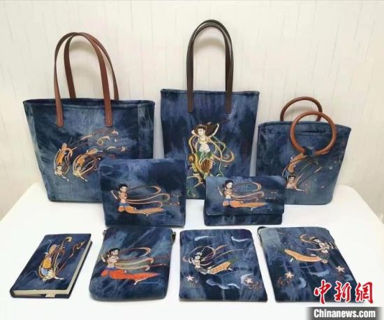 “我創(chuàng)作了《壁畫》系列作品,包含9幅飛天,結合扎染、手繪、刺繡工藝,大家反饋很好。”許靜說,該作品中采用牛仔布料,體現(xiàn)飛天的厚重感和年代感。