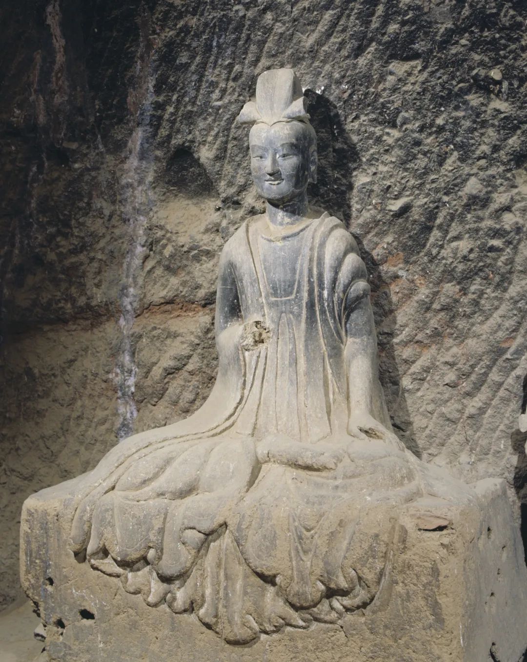 從題材上看,以單尊佛、菩薩、力士等為主,風(fēng)格上更具有寫實(shí)性。造像面相橢圓飽滿,斜眉吊目,懸鼻小口,表情森嚴(yán)、凝重,服飾簡潔、質(zhì)樸,寬博厚重,極富質(zhì)感。其中佛低平螺髻,前置肉髻珠,身穿垂領(lǐng)袈裟。菩薩束發(fā)高髻或戴風(fēng)帽,眉目慈祥,身材比例協(xié)調(diào)、準(zhǔn)確。力士表情生動傳神,體形孔武雄健,充滿陽剛之氣,給人以強(qiáng)烈的力量和威武感;這段時(shí)間造像前衰后盛也與當(dāng)時(shí)秦州所處環(huán)境有密切關(guān)系。