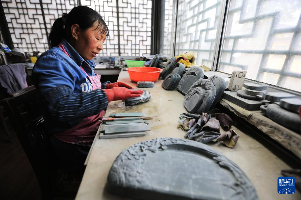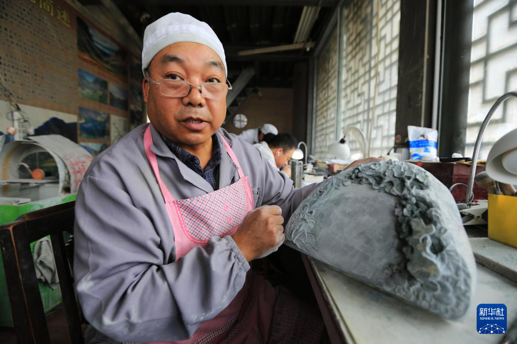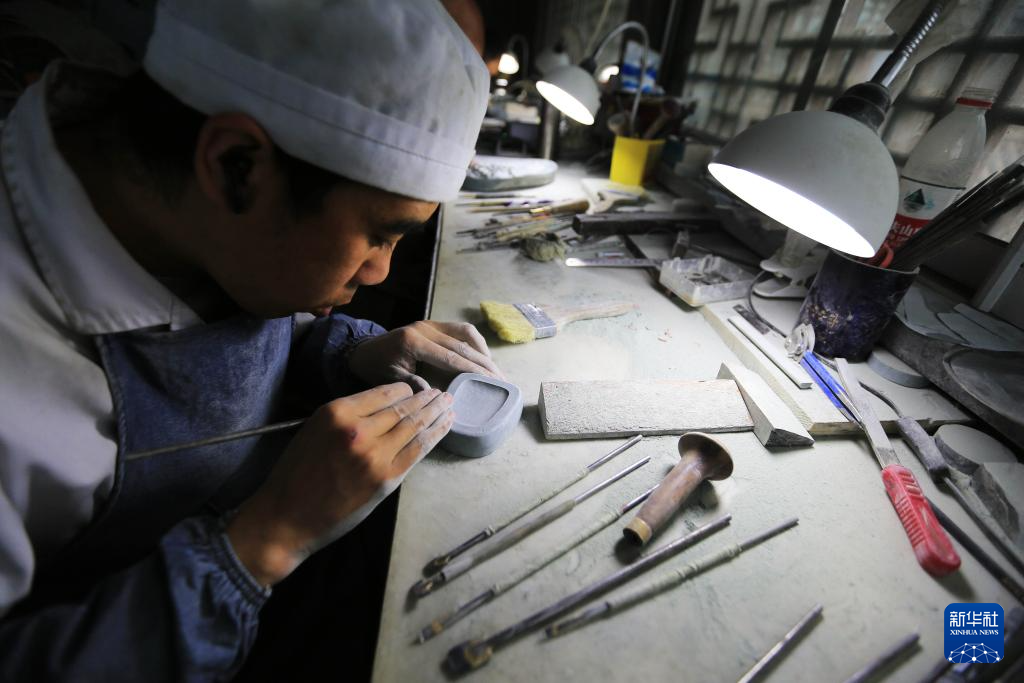 10月24日,藝人在甘肅省定西市臨洮縣洮硯藝術(shù)館雕刻制作洮硯。新華社發(fā)(王克賢 攝)