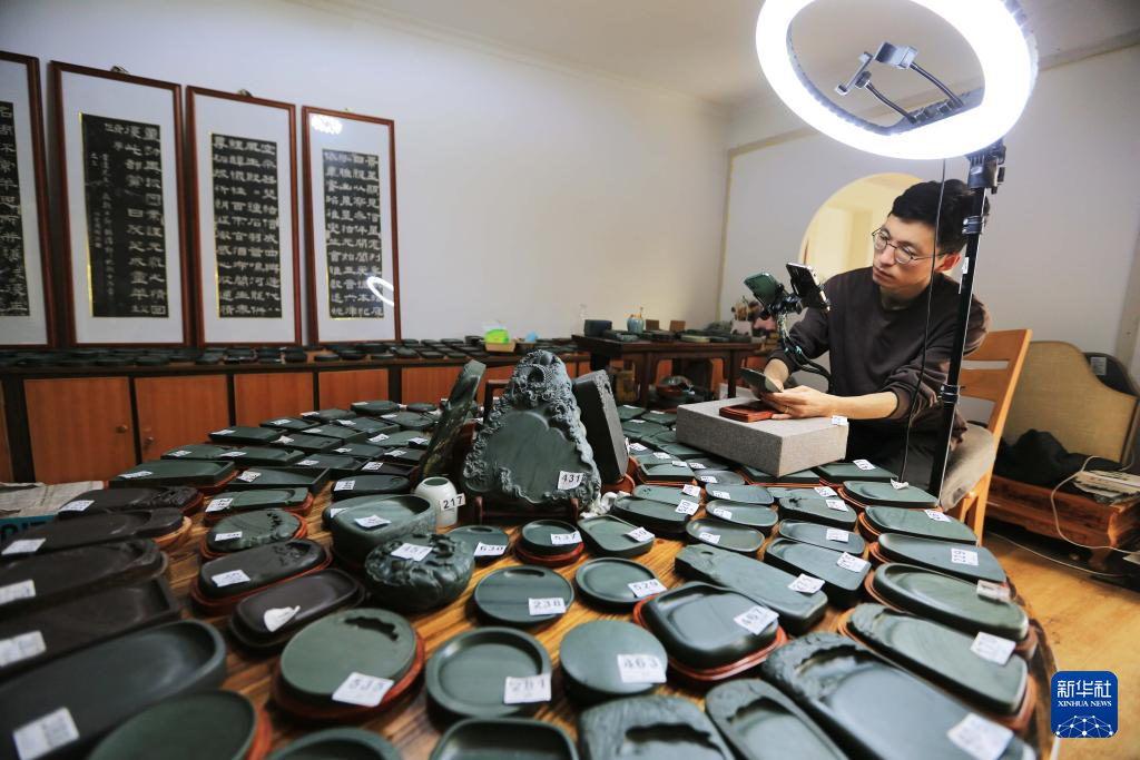 10月24日,工作人員在甘肅省定西市臨洮縣直播銷(xiāo)售洮硯。新華社發(fā)(王克賢 攝)