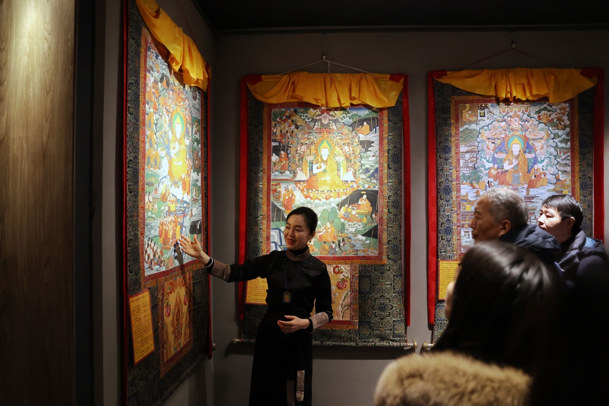 ?。ㄓ浾?nbsp;姜東)2023年12月26日,北京,觀眾在皇城藝術(shù)館參觀《甘肅甘南非遺文化藝術(shù)展》。近日,《甘肅甘南非遺文化藝術(shù)展》在北京皇城藝術(shù)館開展。此次展覽主要展示了甘南藏族自治州非物質(zhì)文化遺產(chǎn)藝術(shù)作品《拉卜楞文化歷史彩繪藝術(shù)大觀》《藏族書法瑰寶》及甘南拉卜楞文創(chuàng)產(chǎn)品。