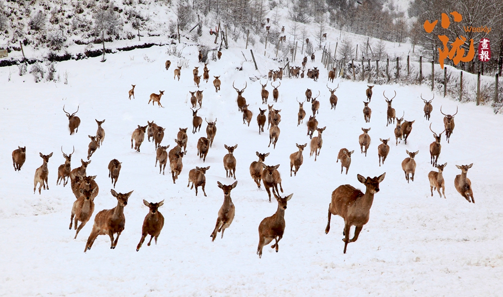 雪滿山川,素白沉靜。關(guān)灘溝鹿場的梅花鹿,在躲了一夜的風(fēng)雪后成群結(jié)隊出來,或是雪中覓食,或是雪中撒歡,它們活潑的嬉戲好一幅祥和畫面。