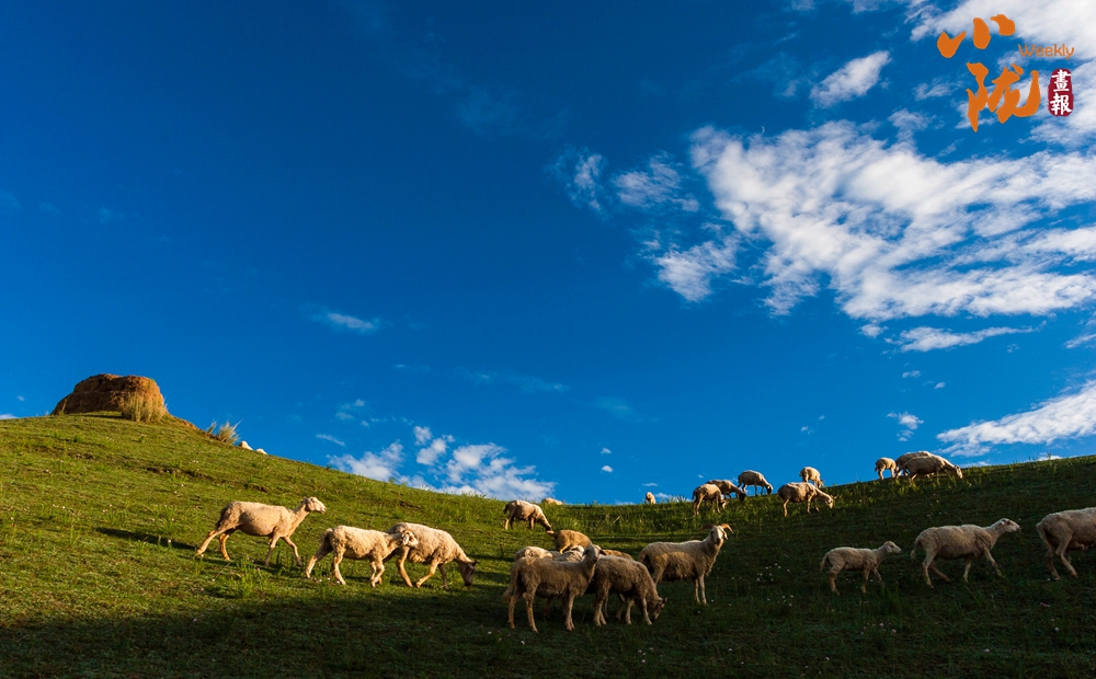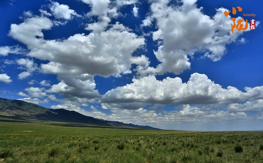 遠處白云悠悠,百萬畝草原一望無垠,羊群點綴的大草原和那殘存的烽火臺相映成趣,呈現(xiàn)出一幅綠意盎然的詩意畫卷。