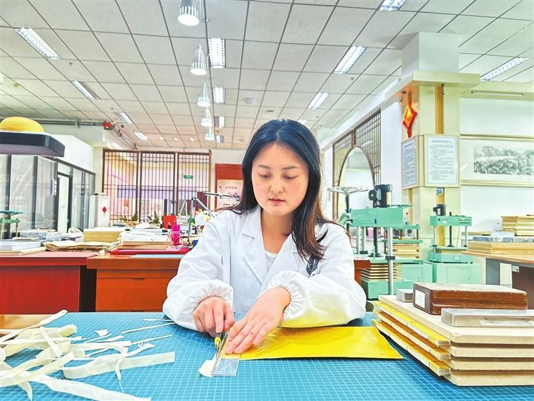 從事這項(xiàng)工作快滿3年了,從最開(kāi)始的“坐不住”到現(xiàn)在的“沉得下”,羅雪瑞的修復(fù)技藝在不斷進(jìn)步。“我一直就比較喜歡做手工,古籍修復(fù)不僅讓我感到充實(shí),也讓我非常有成就感。”羅雪瑞說(shuō),每次來(lái)到自己的工作臺(tái)前,心緒就能很快靜下來(lái),沉浸在古籍的世界里,感覺(jué)特別踏實(shí)。