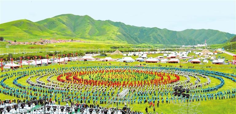 壯觀的萬人鍋莊舞展演在碌曲縣夏澤灘草原上演。新甘肅·甘肅日報(bào)記者 馬伊星