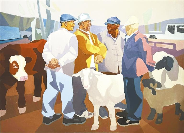 《和風(fēng)》系列作品取材于禮縣鹽官鎮(zhèn)騾馬市場逢集時(shí)交易的場景。幼時(shí),我經(jīng)常隨父親去鹽官騾馬市場趕集,對這個(gè)場景熟悉且親切。也正因?yàn)槿绱耍覍@個(gè)題材有著難以割舍的情愫,總是忍不住想通過畫筆呈現(xiàn)這一記憶。