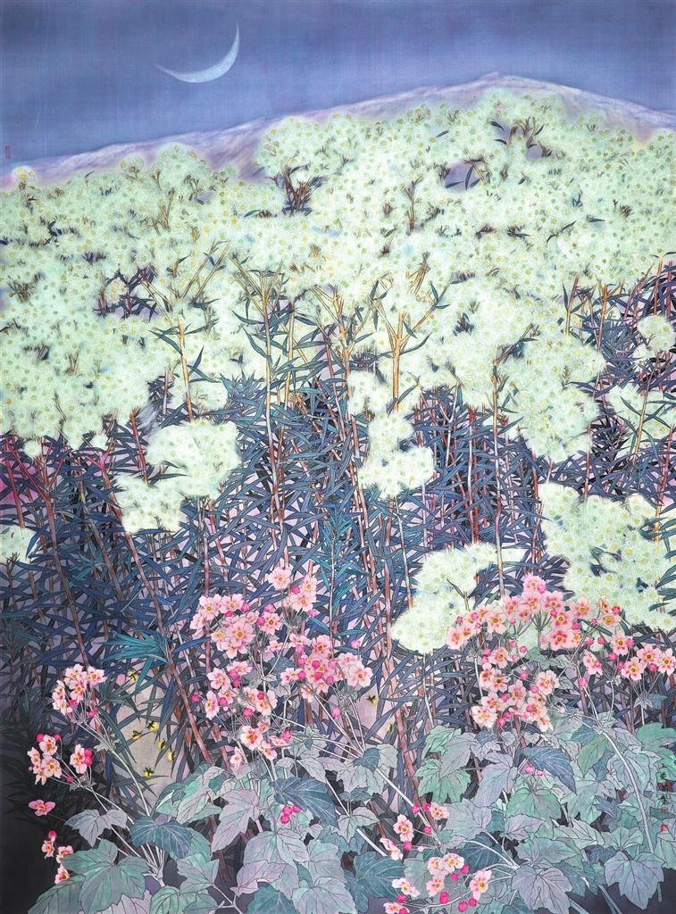 《白露》主要以白色野花香青為主體,野棉花為輔。拉長香青的枝干,以增強(qiáng)畫面的氣勢,繁茂的白花溫馨、浪漫,婀娜的野棉花花朵打破畫面的單調(diào),葉子又構(gòu)成小團(tuán)塊整體。夜幕下一輪新月,應(yīng)和著紫灰色的畫面主色調(diào),增強(qiáng)了這種美好氛圍。
