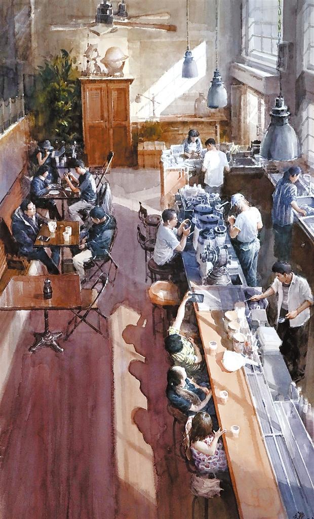 《網(wǎng)紅咖啡館的午后》用寫實(shí)方法展現(xiàn)了一個(gè)溫馨的生活場景。在構(gòu)圖上,以俯視的角度用大場景來做整體畫面的籌劃,在整體色調(diào)上以沉穩(wěn)厚重的暖色作為基調(diào),把光線穿插、引入到畫面中。在布局上,以陽光照耀下的咖啡館吧臺(tái)為主要表現(xiàn)組群,分別刻畫、塑造了工作中的前臺(tái)人員、打卡拍照的女性顧客群;把暗部區(qū)域,幾組在咖啡桌邊交談、用餐、喝咖啡的顧客群作為第二層次,展現(xiàn)他們不同的神情和體態(tài);然后完善整體的空間感。在用筆上盡量以松動(dòng)的筆觸,又能展現(xiàn)細(xì)節(jié)的方式來塑造,利用水彩畫需要干、濕、松、緊相結(jié)合,多層次、多遍數(shù)進(jìn)行渲染的特性,盡可能達(dá)到預(yù)期效果。 (本版文圖由甘肅省美術(shù)家協(xié)會(huì)提供)
