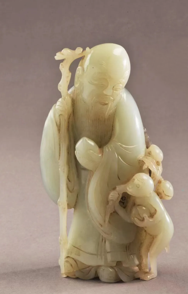 玉壽星,清代,高15.5厘米,寬9厘米,厚4.7厘米。用整塊和田青白籽料琢制,正面玉質(zhì)潔白溫潤,背部有黑灰泌色。壽星頭微左傾,桃額,慈目善眉,大耳長頸,著廣袖大袍,左手持壽桃,右手持龍首杖,袍下微露云頭履。左側(cè)有一躬身站立猴子,左臂抱一壽桃,右肩扛桃枝。玉雕為俏色雕刻而成,融圓雕、線刻、透雕等手法,將壽星的慈祥和小猴子的可愛表現(xiàn)于一體。