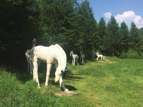 在碧草連天的谷地,當(dāng)?shù)芈糜尾块T擺放了一組白馬的大型雕塑,栩栩如生,它們要么仰天長(zhǎng)嘶,要么低首撫弄地上的青草,還有的彼此耳鬢廝磨,像是親密的戀人。