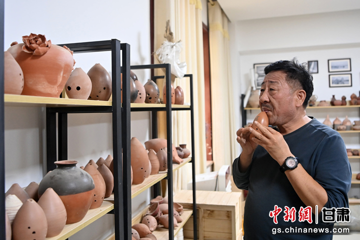 2024年9月3日,圖為關(guān)振國(guó)吹奏陶塤。九美旦增 攝