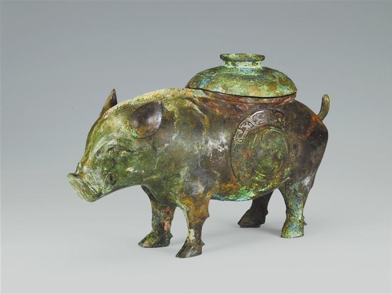 山西省曲沃縣北趙村晉侯墓地113號墓出土。豬尊出土于第一代晉侯燮父的夫人墓中。背上有蓋,蓋面飾云雷紋。器腹兩側各飾同心圓渦紋,周圍飾變形獸面紋。蓋內(nèi)及外底均有銘文:“晉侯乍(作)旅飤(sì)”。“飤”通“食”,多用于青銅食器上,而此尊應是盛酒器,在酒器上自銘為飤,較為罕見。豬是伴隨著農(nóng)業(yè)文明的出現(xiàn)而成為最早飼養(yǎng)的動物之一,先秦時期多用作祭祀活動的祭牲。晉侯墓地出土的豬尊,將酒器青銅尊鑄成日常生活中豬的形象,造型逼真,憨態(tài)可掬,工藝精湛,充分體現(xiàn)了青銅工匠的聰明才智。