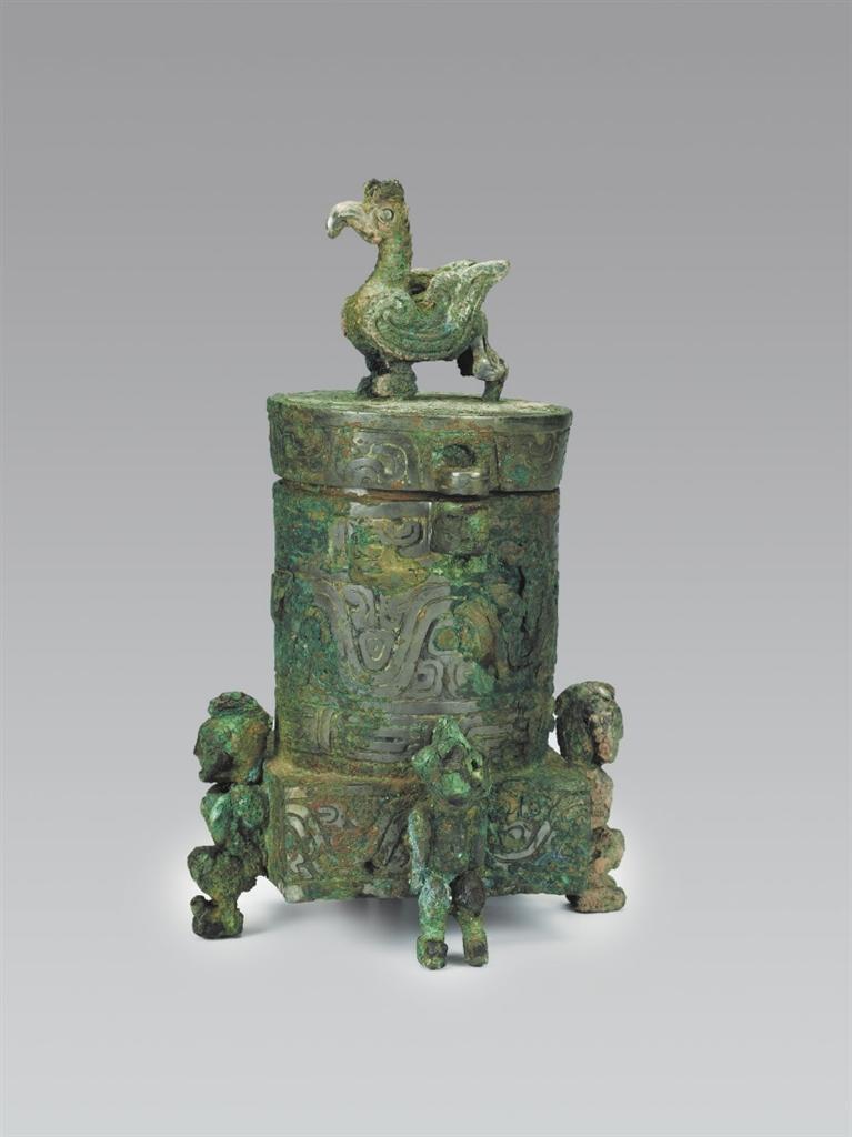 山西省曲沃縣北趙村晉侯墓地63號墓出土。圓筒形,帶蓋,蓋與器體以子母口套合,蓋平頂,上有圓雕立鳥形鈕,鳥彎喙,雙目圓睜,作展翅欲飛狀。器為平口,口沿有一對貫耳,直壁,方形底座,底座四壁各有一個人形足以承器體。人發(fā)髻高聳,赤身裸體,屈膝下蹲,作奮力抬舉器物狀,形象寫實生動。方座飾波曲紋,內(nèi)底有兩只小鈴,可發(fā)聲。蓋頂飾斜角云紋一周。蓋沿和口沿飾變形獸體紋,筒腹和方座飾波曲紋,筒下層飾鱗紋一周。這種形制的青銅器尚屬首見,其功用還有待于深入研究,但它獨特的藝術造型和裝飾卻可以說是集眾器之長,獨步天下。
