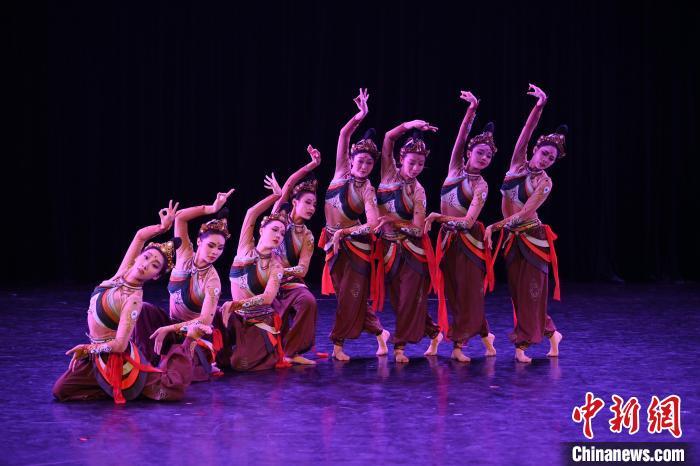 9月6日,由甘肅省人民政府臺(tái)灣事務(wù)辦公室、西北民族大學(xué)聯(lián)合舉辦的“‘尋甘同味·舞樂敦煌’第七屆臺(tái)灣大學(xué)生敦煌文化研習(xí)營(yíng)”結(jié)營(yíng)式在甘肅蘭州西北民族大學(xué)舉行。來自臺(tái)灣中國(guó)文化大學(xué)、臺(tái)灣藝術(shù)大學(xué)、臺(tái)灣體育運(yùn)動(dòng)大學(xué)與西北民族大學(xué)的65名師生在結(jié)營(yíng)式上,合作進(jìn)行了舞蹈音樂創(chuàng)作成果展演,展示了傳統(tǒng)與現(xiàn)代舞蹈的完美融合。圖為當(dāng)日進(jìn)行的舞蹈音樂創(chuàng)作成果演出。中新社記者 李亞龍 攝