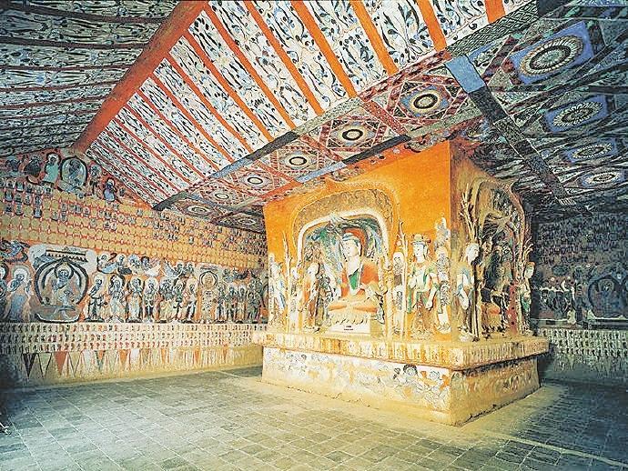 另一個(gè)創(chuàng)新改良的洞窟建筑是中心塔柱窟,其原型是印度支提窟。洞窟平面多呈倒U形;窟內(nèi)空間多被兩列石柱縱向分成三部分,中間是主室,既寬又高,兩邊是側(cè)廊,較低而且比較窄;主室前端是入口,后端是半圓形后室;后室中央雕鑿佛塔,兩側(cè)石柱在佛塔后部相接;主室的頂部為縱向肋骨筒拱,側(cè)廊頂部為半圓扇形。這樣佛教徒就可以經(jīng)過側(cè)廊進(jìn)行繞塔禮拜。在莫高窟北朝第二期洞窟里,中心塔柱才開始大量出現(xiàn),并一直興盛到初唐。