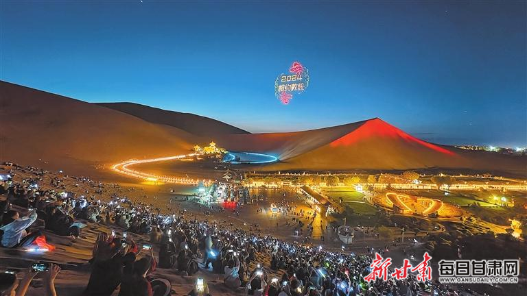 晚9時許,歌曲間隙,600架無人機緩緩飛起,凌空盤旋,隨著律動,漸次變換出“2024相約敦煌”“萬人星空演唱會”等字樣,還展現(xiàn)出鳴沙山月牙泉、敦煌莫高窟和絲綢之路等圖案,引來陣陣歡呼。