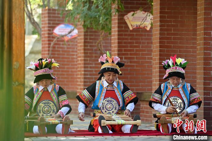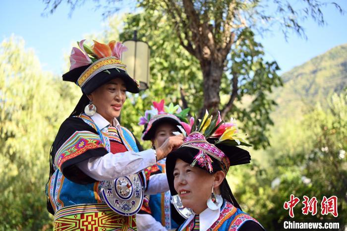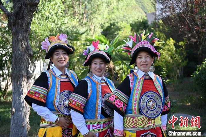 9月26日,甘肅省甘南藏族自治州舟曲縣,當(dāng)?shù)夭刈鍕D女展示錦帶佩戴方式。錦帶是舟曲藏族婦女用以束腰、扎靴、攏發(fā)乃至點(diǎn)綴服飾的花帶子,艷麗多彩、圖案優(yōu)美。每逢吉慶節(jié)日,藏族婦女穿戴的華麗盛裝就需要少則五、六條,多則十幾條寬窄長(zhǎng)短相宜的錦帶來(lái)裝飾。據(jù)介紹,藏族織錦帶技藝歷史悠久,一千多年以前,古羌族和吐蕃已有了較發(fā)達(dá)的手工編織技術(shù),在艱難的生活條件下對(duì)服飾等生活用品除實(shí)用功能之外,已經(jīng)有了強(qiáng)烈的審美追求,是研究舟曲羌藏文化的“活化石”。中新社記者 九美旦增 攝