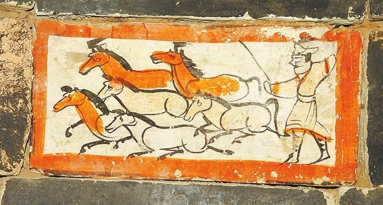 畫師創(chuàng)作時,首先在磚坯表面涂一層白色粉層,然后再勾勒畫面。白粉層多為白堊,偶爾也有用石膏等礦物,彩繪顏料以礦物質(zhì)為主,如石綠、朱砂、赭石等,原料膠結(jié)物為植物膠、動物膠及白礬。有專家指出,嘉峪關(guān)果園—新城魏晉畫磚上的黃色顏料,來自于嘉峪關(guān)附近。礦物質(zhì)顏料的特性,使得艷麗色彩不易脫落,因此彩繪壁畫磚畫即使經(jīng)歷千年歲月磨礪,仍鮮艷如新,奔放熱烈。這些壁畫磚展現(xiàn)了河西魏晉居民粗獷豪邁,不拘一格的精神風(fēng)貌。