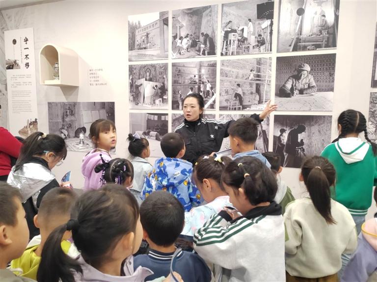 為了使小朋友們能夠身臨其境感受敦煌文化的魅力,主持人還為每一位小朋友發(fā)放了一本“敦煌小畫師”的研學(xué)手冊(cè),并帶領(lǐng)大家前往蘭州市圖書館“近鄰”——敦煌藝術(shù)館進(jìn)行了一場(chǎng)藝術(shù)研學(xué)之旅。在敦煌藝術(shù)館內(nèi),孩子們見證了第220號(hào)石窟的壯觀,欣賞了館內(nèi)200余件文化展品,追溯了莫高窟的歷史淵源,了解了壁畫繪制和建筑元素的藝術(shù)審美,學(xué)習(xí)了“壁上丹青”的顏料密碼。