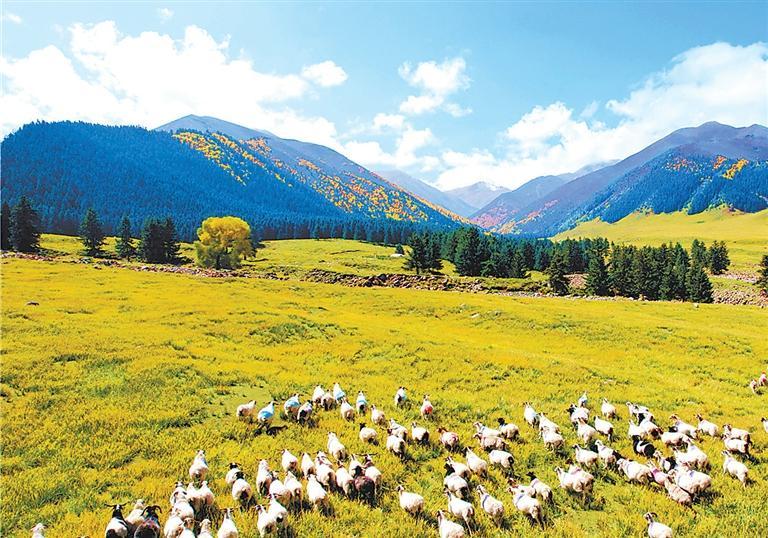 走進景區(qū),映入眼簾的便是布爾智峽谷,其重巒疊嶂,造型奇特。進入峽谷,豁然中開,地勢平坦,視野開闊,形成五山匯集的盆地景觀,一條悠悠的小河穿過盆地的胸膛,明亮清澈。遠山白雪皚皚,山腰云杉參天,山下灌木叢生,蒼翠蔥郁,山底蒼蒼茫茫的草原上,不時涌動著潔白的羊群。徜徉于廣袤的草原,便真正體味到“鳥的世界,花的海洋”的博大內(nèi)涵。