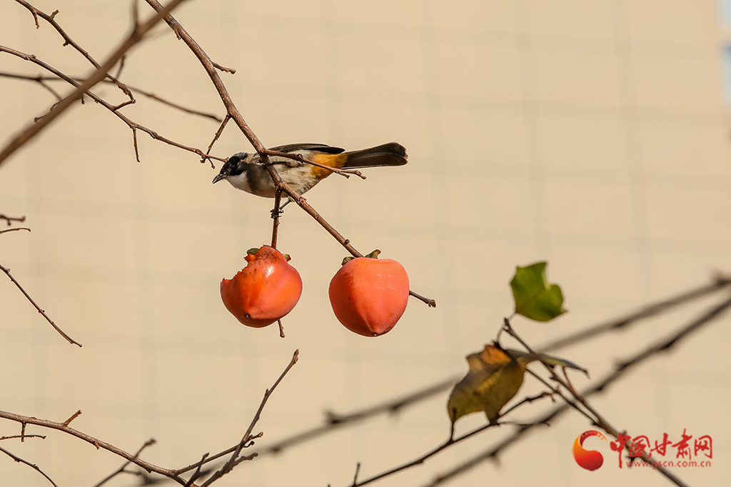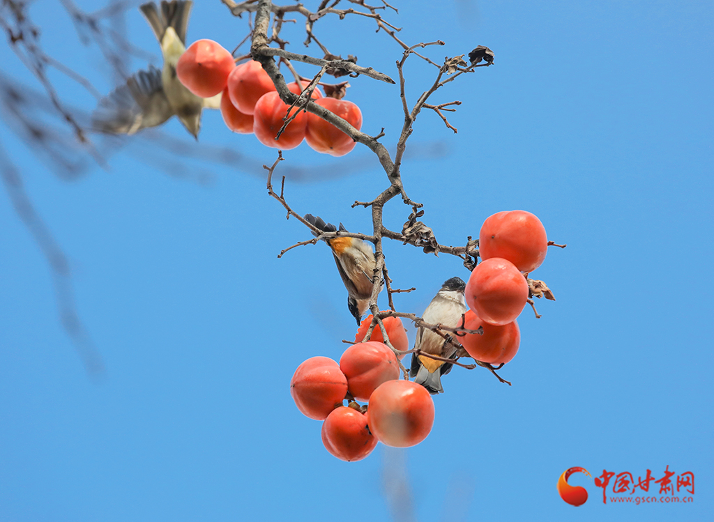 繁華落盡,枝條上一簇簇、一叢叢火紅的柿子在微風(fēng)中搖曳,吸引麻雀前來“聚餐”。麻雀?jìng)儠r(shí)而啁啾歡唱,時(shí)而蹦跳覓食,小巧的身影與柿子交織在一起,勾勒出一幅生動(dòng)的冬日畫卷。