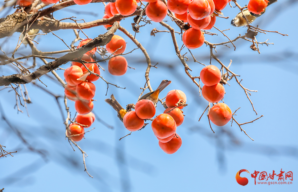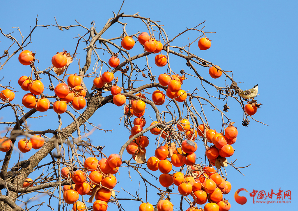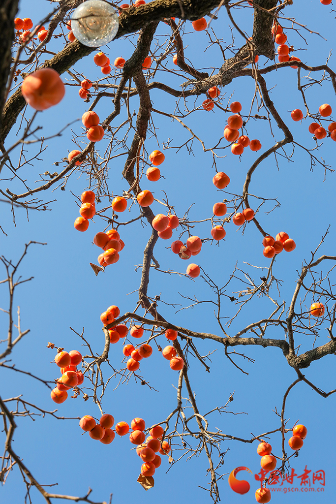 秋去冬來,萬物沉寂。在平?jīng)龀缧牛磷訕渖蠏鞚M了果實(shí),又是一年柿子紅。