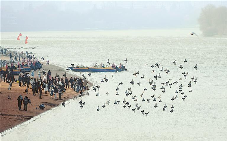 冬日的黃河蘭州段,鴿群飛翔,游人在黃河岸邊盡享愜意時光。新甘肅·甘肅日報(bào)記者 周尚業(yè)