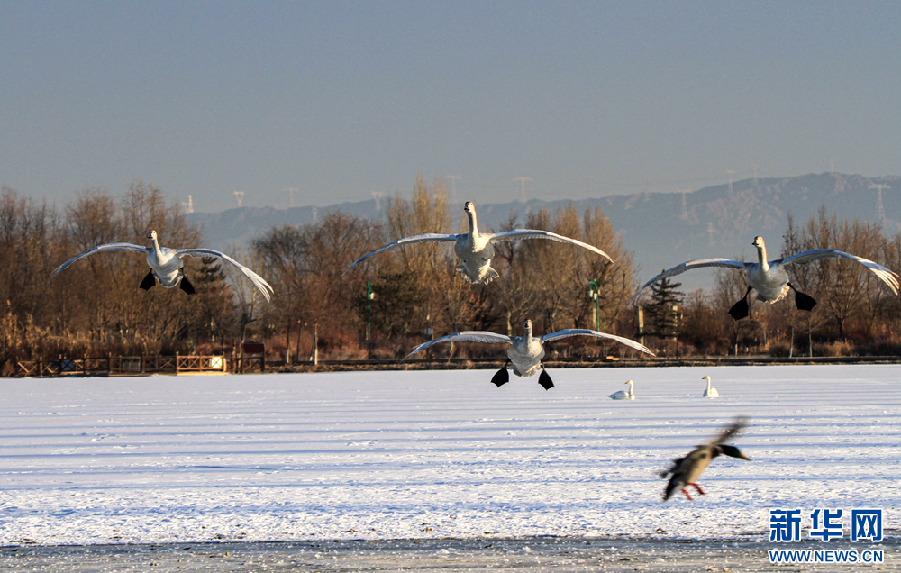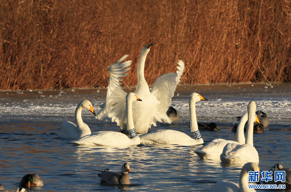 冬日里,在甘肅省張掖國(guó)家濕地公園,數(shù)只白天鵝沐浴著陽(yáng)光悠閑地嬉戲、覓食,呈現(xiàn)出一幅自然和諧的生態(tài)畫(huà)卷。新華網(wǎng)發(fā)(陳禮 攝)
