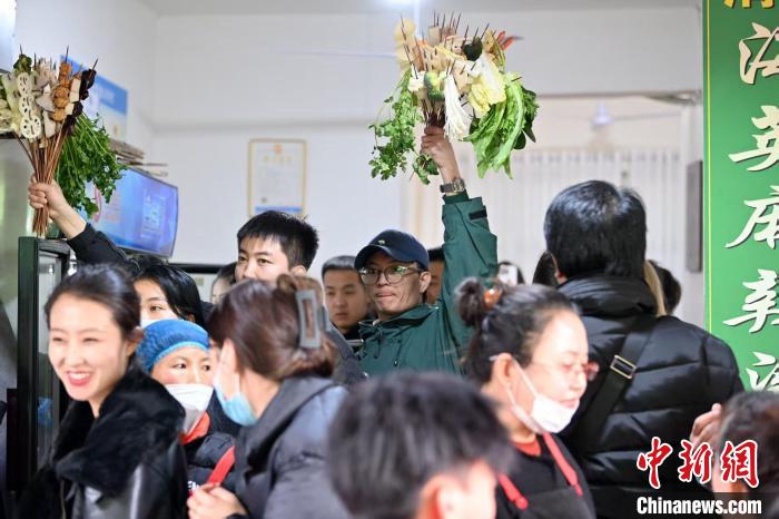 2024年3月14日,甘肅天水,游客手舉挑選的麻辣燙食材。九美旦增 攝