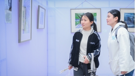 該校學(xué)生在認(rèn)真品鑒精品畫(huà)作