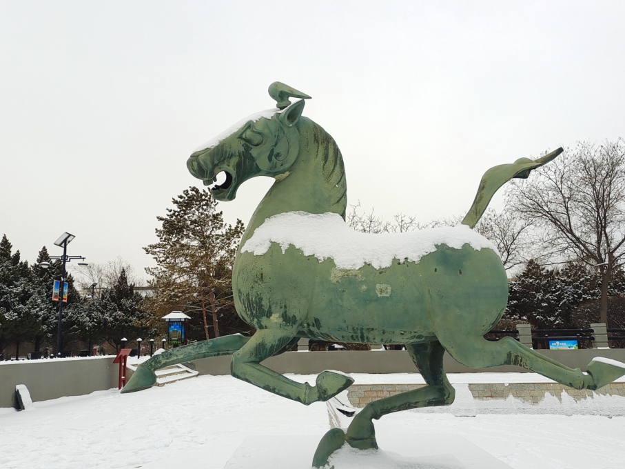 厚德載物的包容精神。特殊的地理環(huán)境,造就了涼州馬文化兼容并蓄、厚德載物的精神特質。涼州大馬是中原馬、西域馬與蒙古馬雜交改良的產物,既保留了蒙古馬的耐力,又兼具西域馬的速度,這種“取長補短”的改良過程,本身就是包容精神的具體體現。“馬踏飛燕”作為東西方文化融合的藝術結晶,其形象既源于中原的“龍馬精神”,又吸納了西域“翼馬”的神話元素,成為兼容并蓄精神的具象化表達。它的鑄造工藝同樣展現出包容的特質,既采用了中原傳統的陶范鑄接法,又融入了西域藝術的浪漫主義風格,寫實與想象完美結合,形成了形神兼?zhèn)洹忭嵣鷦拥乃囆g效果。
