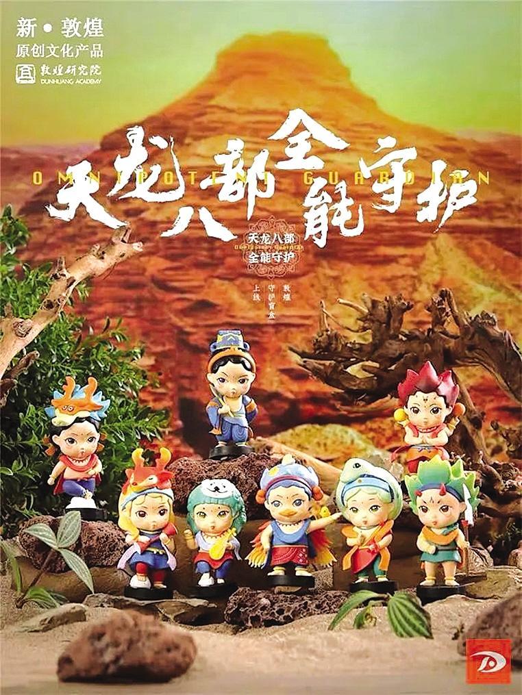 盲盒的設計取自敦煌莫高窟壁畫,特指佛經中的八種神道怪物,和金庸的小說《天龍八部》也有人物對照。盲盒包括迦樓羅、乾闥婆、夜叉、摩睺羅伽、帝釋天、緊那羅、阿修羅、那伽八大護法神形象。這也是繼故宮、河南博物院、三星堆博物館之后,敦煌研究院又推出盲盒。