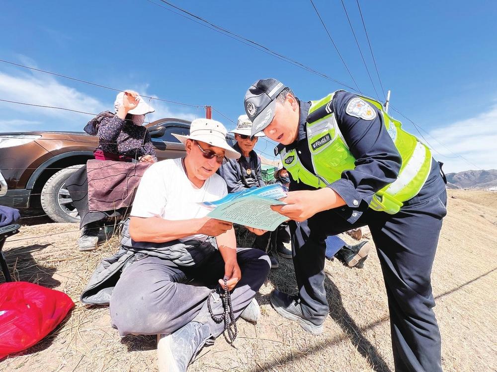 民輔警向群眾講解交通安全知識(shí)。近日,碌曲縣公安局交警大隊(duì)民輔警借助夏澤灘春季賽馬活動(dòng)有利時(shí)機(jī),開展“美麗鄉(xiāng)村行”交通安全巡回宣傳活動(dòng)。 新甘肅·甘肅法治報(bào)記者金凡裕攝
