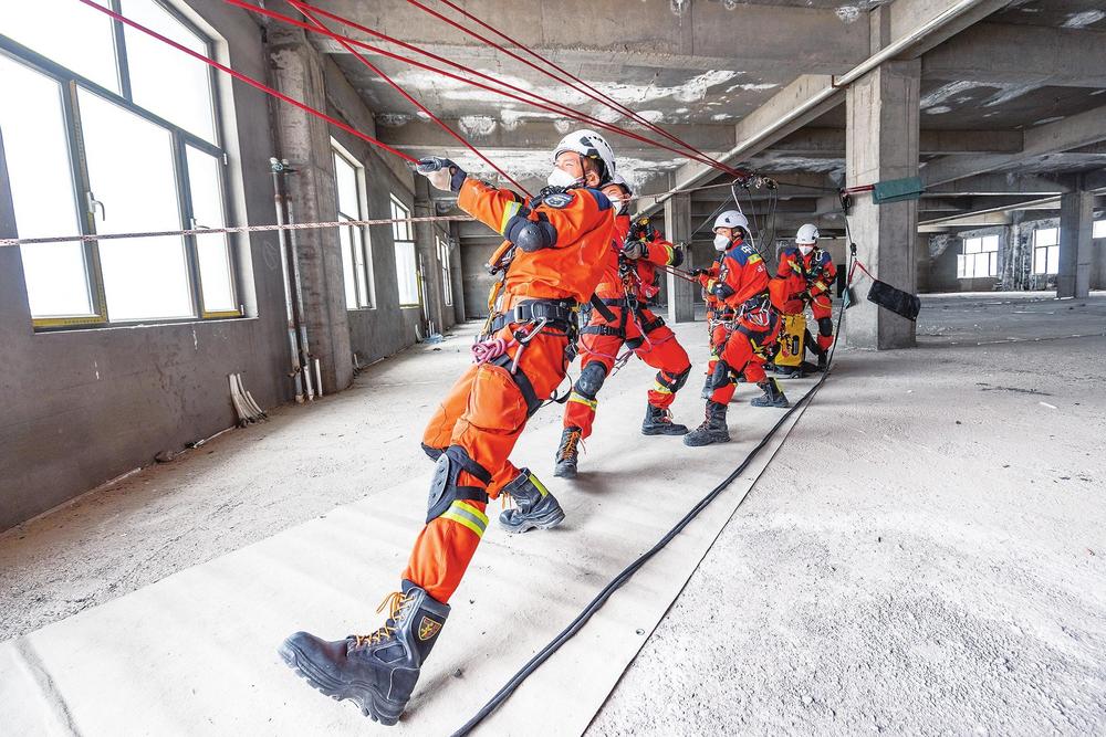 演練現(xiàn)場設置在民樂縣一處廢棄廠區(qū),精心搭建的模擬廢墟區(qū)真實還原了地震后的慘烈場景:斷裂的預制板下壓著被困者,傾倒的鋼架阻斷逃生路徑,熊熊燃燒的化工廠冒出濃煙……12個高難度救援科目輪番上演,每一處細節(jié)都直擊地震救援的核心挑戰(zhàn)。