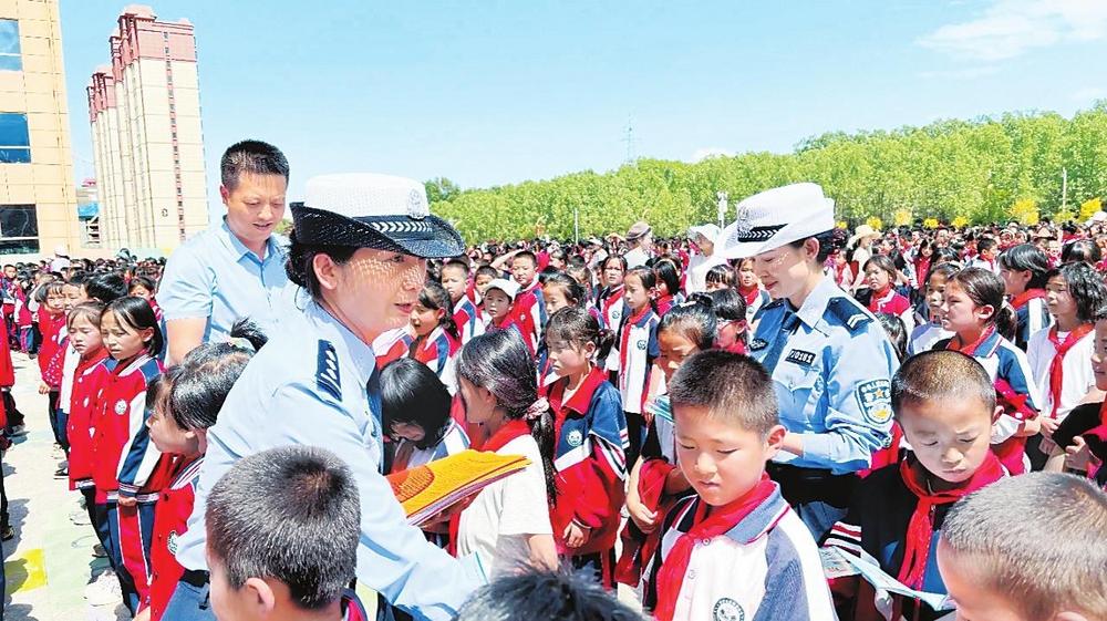 民警向?qū)W生發(fā)放宣傳資料。6月26日,積石山縣公安局交警大隊民警走進城西小學(xué),開展“知危險會避險”交通安全宣傳教育活動,給學(xué)生們上了一堂暑期交通安全課。 新甘肅·甘肅法治報通訊員趙小紅攝