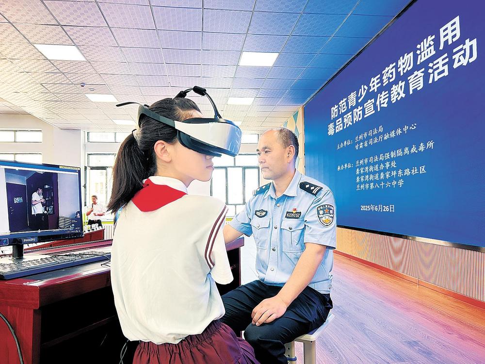 2025年6月26日,蘭州市司法局強制隔離戒毒所干警走進蘭州市第八十六中學開展禁毒宣傳教育。圖為學生佩戴VR眼鏡,通過虛擬現實技術創(chuàng)造逼真的沾染毒品場景,讓學生身臨其境地感受毒品的危害。