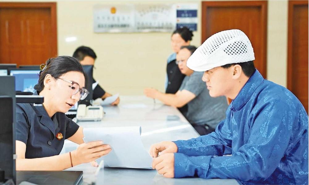 肅北縣人民法院立案庭蒙漢雙語法官助理接待當(dāng)事人(2025年8月拍攝)。
