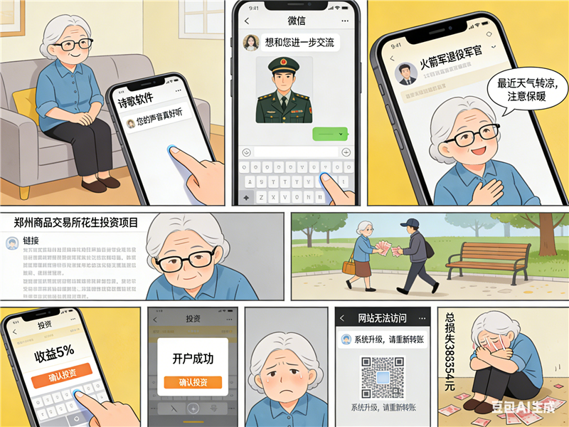 警方拆解該案騙術(shù)發(fā)現(xiàn),騙子共分七步將紀奶奶從“詩友”變成“提款機”。第一步,潛入詩歌朗誦這類中老年人聚集的興趣社群,精準篩選目標;第二步,以“聲音好聽”為切入點,通過情感鋪墊營造“黃昏戀”錯覺,建立情感依賴;第三步,多次切換聊天軟件,躲避平臺反詐監(jiān)測;第四步,偽裝“火箭軍”身份,利用老一輩對軍人的天然信任感,以國家信譽背書;第五步,讓老人幫忙操作虛假賬戶,親眼見證“穩(wěn)賺5%”的假象;第六步,邀請老人自己投資,誘導其向個人銀行卡轉(zhuǎn)賬;第七步,要求線下現(xiàn)金交易,繞過銀行風控,增加資金追回難度。
