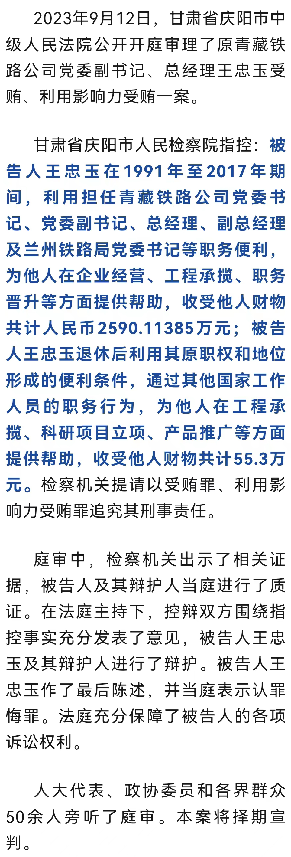 原標(biāo)題:《原青藏鐵路公司黨委副書記、總經(jīng)理王忠玉受賄、利用影響力受賄案一審開(kāi)庭》