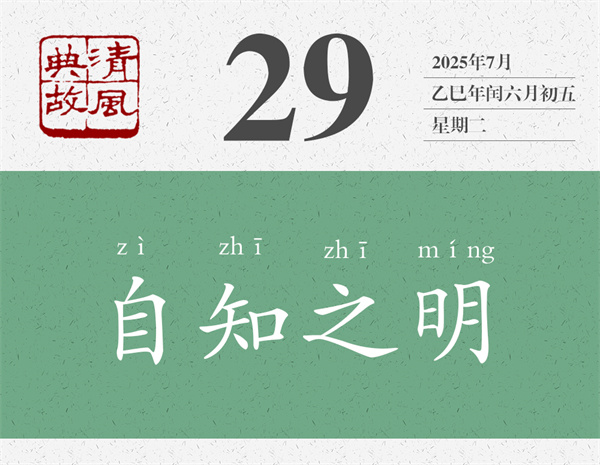 《老子•三十三章》:“知人者智,自知者明。勝人者有力,自勝者強。知足者富。強行者有志。不失其所者久。死而不亡者壽。”陳鼓應(yīng)先生譯為:認識別人的是“智”,了解自己的才算“明”。戰(zhàn)勝別人的是有力,克服自己的才算堅強。知道滿足的就是富有。努力不懈的就是有志。不離失根基的就能長久。身死而不朽的才是長壽。