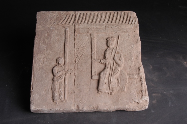 宋代??v30.2厘米,橫30.7厘米,厚3厘米。征集。磚呈長方形,青灰色,通過模印工藝展示了屋檐下一婦人坐于窗臺前,給一端物的幼子訓話的場景,是研究宋代社會生活、家庭倫理及畫像磚藝術的珍貴實物資料。